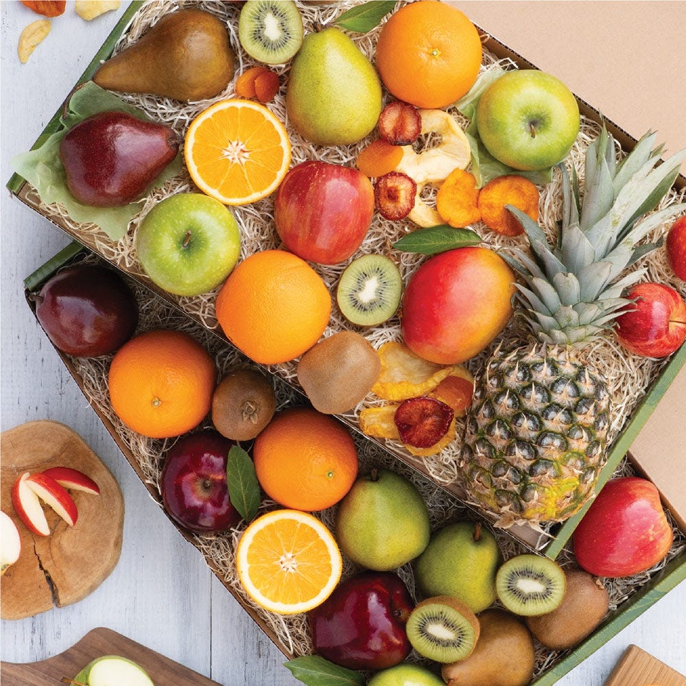 9 lbs of Orchard Fresh Northwest Pears and Apples, Juicy California Citrus, and a selection of seasonal fruit favorites that will change throughout the year including Pineapple, Kiwi, Mangoes, Cherries, Peaches, Dried Fruit and more!